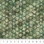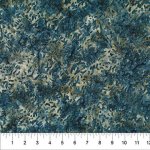 Batik fabric featuring a navy blue background with variating blue and green arches and shapes.